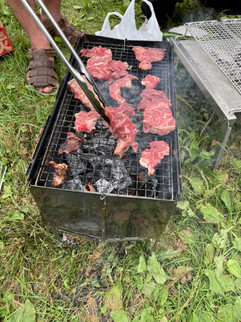 タープの下に避難したけど、火が使えずに明るいうちに焼けたはずのお肉、焼けず。